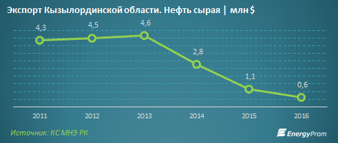Из Кызылординской области в 2016 году в КНР было экспортировано 2,3 млн тонн сырой нефти стоимостью $600,8 млн. В денежном выражении экспорт упал почти в два раза за год, а в физическом выражении — на 20%.