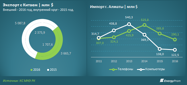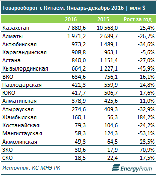 За 2016 год товарооборот Алматы с КНР составил $1,9 млрд, что меньше уровня 2015 года на -28%.