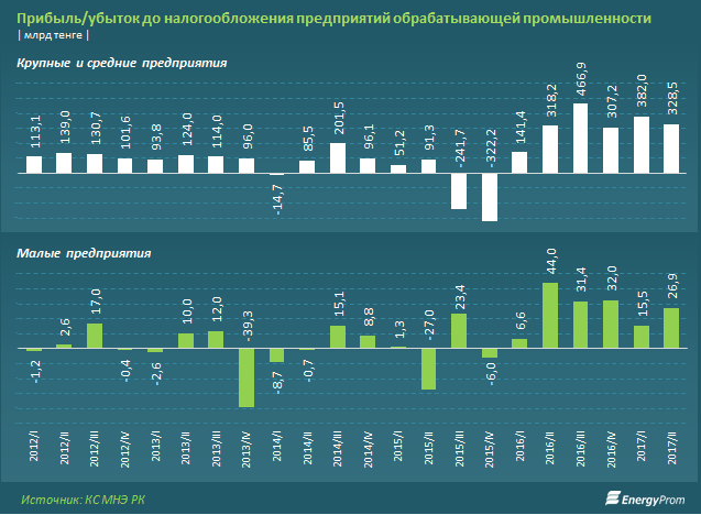 В малом секторе обрпрома ситуация иная: полученная прибыль до налогообложения во 2 квартале 2017 года оценивается в 26,9 млрд тенге, или на 11,4 млрд тенге (+73,2%) больше суммы за 1 квартал.