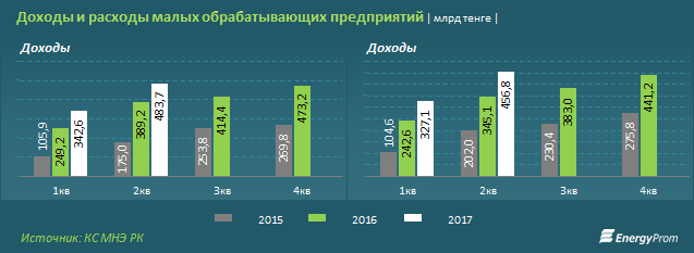У малых предприятий отрасли, напротив, скорость притока доходов превышала темпы роста расходов. Во 2 квартале совокупные доходы таких предприятий обрпрома составили 483,7 млрд тенге, что на 141,1 млрд тенге больше, чем за 1 квартал.