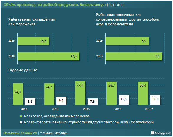 По данным Министерства экологии, геологии и природных ресурсов РК, в 2019 году запланирован выпуск в естественную среду обитания 78,4 млн молоди ценных видов рыб. Госпрограммой развития АПК прогнозируется рост объёмов рыбоводства с 1,5 тыс. до 5 тыс. тонн к 2021 году. В текущем году намечено вырастить порядка 3 тыс. тонн товарной рыбы.