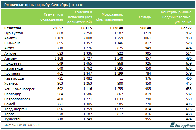 Розничные цены на рыбную продукцию значительно возросли. Так, свежая или охлаждённая рыба в сентябре текущего года стоила в среднем по республике 756,6 тг за кг — на 14,7% больше, чем в соответствующем периоде прошлого года (659,6 тг за кг). Дороже всего свежая рыба обходится жителям Алматы и Атырау, цена в этих регионах составила 1109 и 1108 тг соответственно.