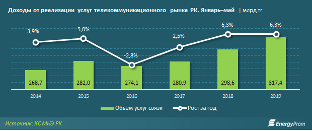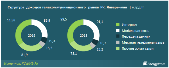 63,2% доходов на рынке телекоммуникаций обеспечивают услуги интернета и мобильной связи. Непосредственно интернет обеспечивает уже 35,8%. Это 113,8 млрд тг за пять месяцев — на 14,3% больше, чем годом ранее. В то же время доходы от мобильной связи за январь–май текущего года составили 86,9 млрд тг, что на 4,6% меньше, чем за тот же период прошлого года (91,1 млрд тг).
