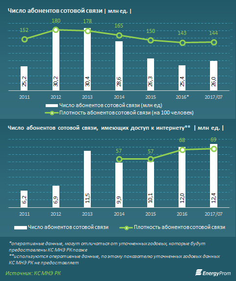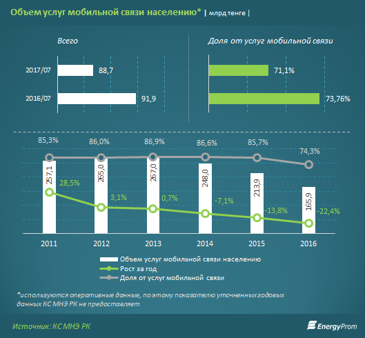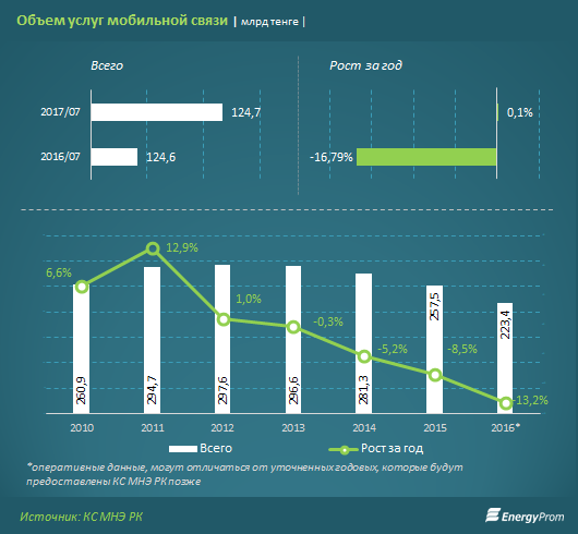 По итогам 7 месяцев объем услуг операторов мобильной связи составил 124,7 млрд тг — всего на 0,1% больше, чем в аналогичном периоде годом ранее. Для сравнения, объемы за январь-июль 2017 показывали годовой спад на 16,8%.