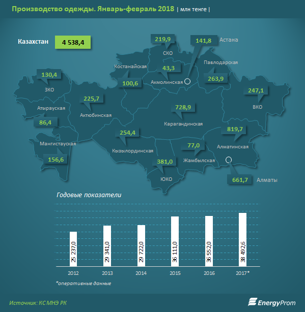 Наибольший объем производства в секторе пришелся на Алматинскую область — 18,1% от РК, 819,7млн тг — сразу на 51% больше, чем годом ранее. В регионе работают такие крупные компании, как ТОО «Glasman», ТОО «Арлан 777», ТОО «ТФ Ажар» (производство верхней одежды), ТОО «Медиатекс-Н» (выпуск головных уборов), ТОО «Texti Market» (производство вязаных и трикотажных изделий) и т.д.