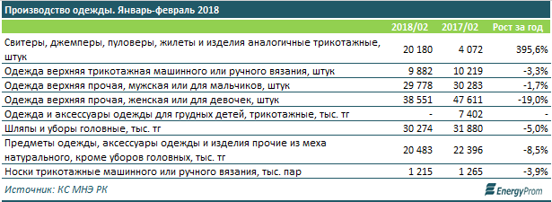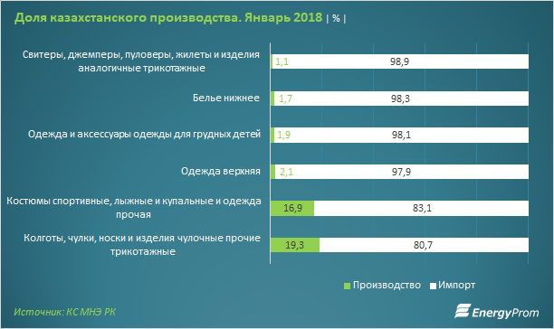 По итогам января 2018 доля казахстанского производства в сегменте одежды хоть сколько-то значима лишь в сегментах носочно-чулочных изделий (19,3%), и спортивных костюмов (16,9%). Во всех прочих сегментах казахстанские производители перекрыли лишь порядка 1-2% спроса на одежду.