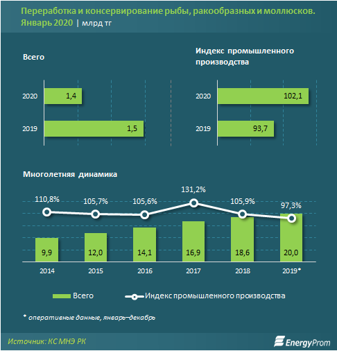 В целом за январь–декабрь 2019 года выпуск в секторе переработки и консервирования рыбы, ракообразных и моллюсков составил 20 млрд тенге, что означало сокращение производства на 2,7%. Для сравнения: в январе–декабре 2018 года сумма производства достигла 23,1 млрд тг, рост производства — 8,3%.