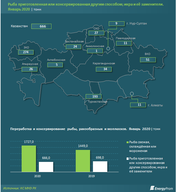 По данным Комитета по статистике МНЭ РК, за январь 2020 года в натуральном выражении казахстанские компании произвели 1,7 тысячи тонн свежей, охлаждённой или мороженой рыбы — на 19,2% больше, чем в январе 2019-го; выпуск приготовленной или консервированной другим способом рыбы, икры и её заменителей составил 666 тонн, отмечен спад производства на 4,6%.