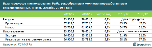 Казахстанская рыбная промышленность не смогла полностью обеспечить спрос (экспорт плюс реализация) на переработанную рыбу, ракообразных и моллюсков. За январь–декабрь 2019 года потребности были перекрыты местным производством менее чем на половину — на 45,3%.