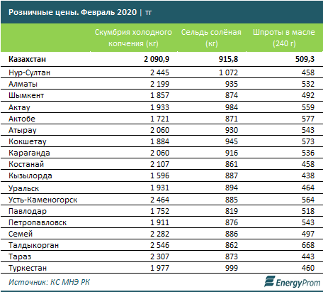 Цены на розничном рынке ощутимо отличаются в зависимости от региона. В среднем скумбрия холодного копчения в феврале текущего года стоила 2091 тг за кг, солёная сельдь — 915,76 тг за кг, шпроты в масле — 509,3 тг за 240 г.