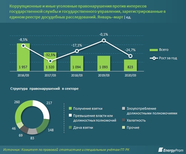 В первом квартале текущего года в Казахстане зарегистрировано 823 коррупционных и иных уголовных правонарушения против интересов государственной службы и государственного управления — на 24,7% меньше по сравнению с январём–мартом прошлого года.