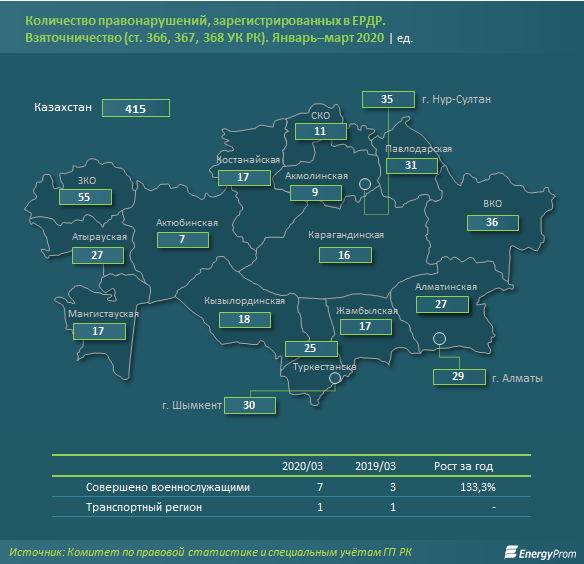 Антилидерами по взяточничеству среди регионов стали Западно-Казахстанская и Восточно-Казахстанская области, а также Нур-Султан.