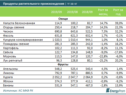 В этом году сезон дешёвых свежих овощей закончился относительно рано. В сентябре цены на капусту и огурцы выросли к августу почти на 15%. На 7,3% подорожал чеснок, на 1,7% — фасоль.