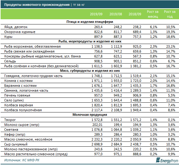 Среди продуктов животного происхождения в сентябре резко подорожали яйца — сразу на 6,1% за месяц. На 2,3% выросла в цене мороженая рыба, на 2,1% — говядина, на 2% — конина.
