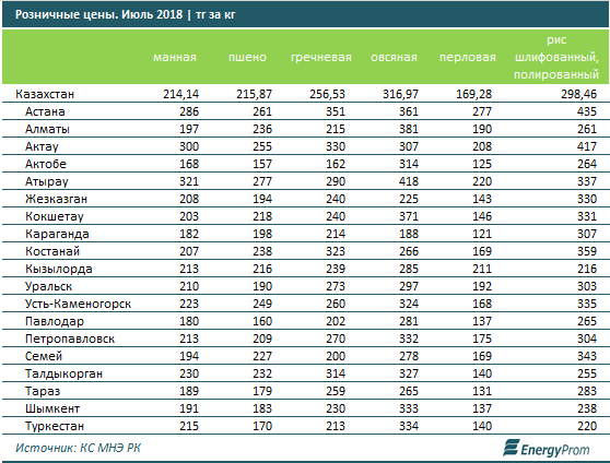 Так, по итогам июля гречневая крупа стоила 256,5 тг за кг — это сразу на 29,7% меньше, чем годом ранее. В результате самое дорогой кашей стала овсянка — 317 тг за кг, +6,5% за год.