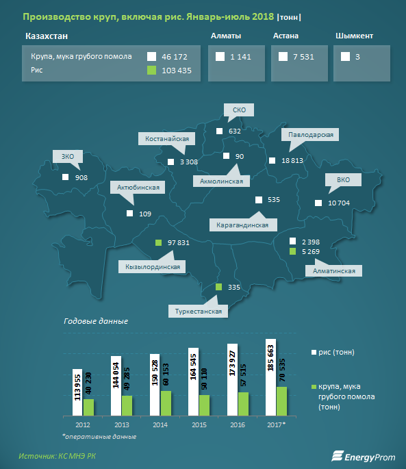 Основные производители круп — Павлодарская область (40,7% от РК), ВКО (23,2%) и Астана (16,3%). Среди наиболее известных крупных брендов — например, «Цесна» (ТОО «Концерн «Цесна-Астык»).