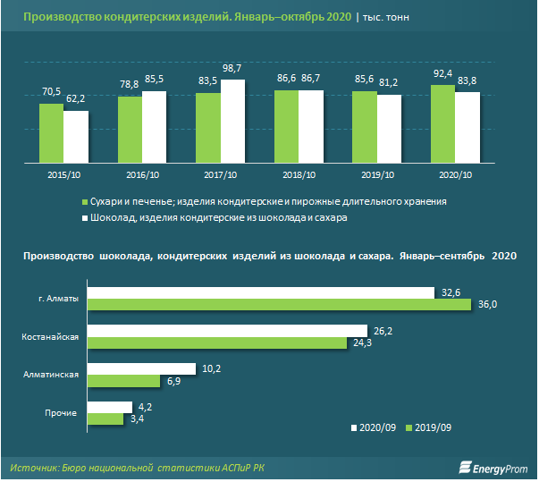 Тем временем производство шоколада и кондитерских изделий из него выросло на 3,2% за год, до 83,8 тыс. тонн. В региональном разрезе по итогам трёх кварталов 94,3% выпуска пришлось всего на три региона: Алматы, Костанайскую и Алматинскую области.
