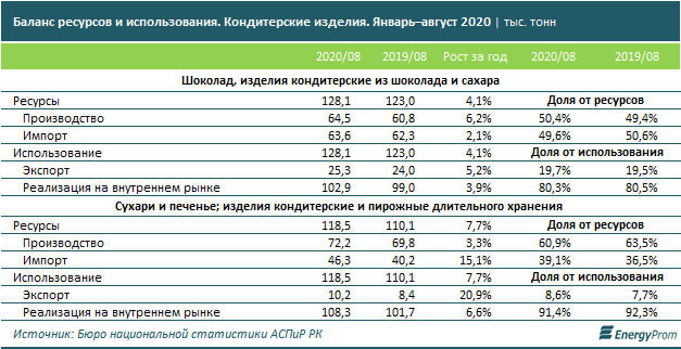 По итогам 8 месяцев местные кондитерские компании обеспечили спрос (экспорт плюс реализация на внутреннем рынке) на шоколад и кондитерские изделия из него на 50,4%. На долю импорта пришлось 49,6%. В страну завезли 63,6 тыс. тонн шоколада и кондитерских изделий — на 2,1% больше, чем годом ранее. На экспорт было отправлено 25,3 тыс. тонн шоколада и шоколадных кондитерских изделий — плюс 5,2% за год.