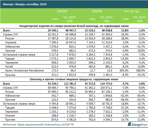 За январь–сентябрь 2020 года в страну завезли 29,5 тыс. тонн кондитерских изделий из сахара — сразу на 15,8% больше, чем в прошлом году. В денежном выражении импорт составил 48,4 млн долл. США, минус 1% за год. Главные поставщики в секторе — страны СНГ: 26,3 тыс. тонн, на 40,6 млн долл. США. Рост в натуральном выражении составил 18,3%; в то же время в денежном выражении импорт, напротив, упал на 2,5%.