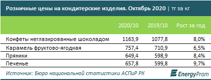 Выросли также цены на фруктово-ягодную карамель (на 6,5% за год, до 757,5 тг за кг), пряники (на 8,4%, до 649,4 тг за кг) и печенье (на 9,7%, до 657,8 тг за кг).