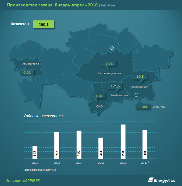 Еще 18,7% обеспечили производители Алматинской области. Здесь находится еще несколько филиалов ЦАСК — Коксуский сахарный завод, Аксуский, Бурундайский, Ескельдинский, Алакольский.
