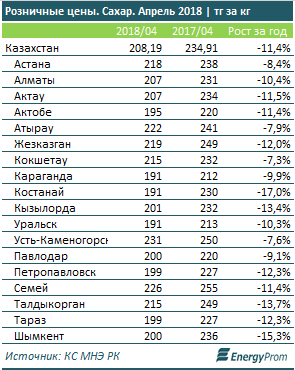 Цены на сахар в рознице выросли за месяц на 2,8%, до 208,2 тг за кг по итогам мая. Впрочем, это все еще на 11,4% меньше, чем годом ранее.