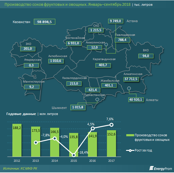 Производство ушло в минус во всех регионах Казахстана, кроме Астаны: в столице выпуск фруктовых и овощных соков вырос сразу на 40% по сравнению с соответствующим периодом 2017 года — до 9,7 млн литров (это уже 9,9% от РК, против 6,3% годом ранее).