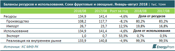 По итогам августа (за 8 месяцев текущего года) казахстанские компании обеспечили спрос на фруктовые и овощные соки на 80,2%.
