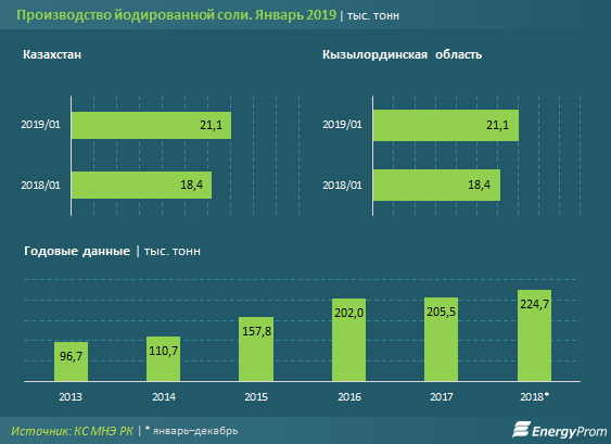 Заметим, по итогам прошлого года доля жаксыкылышского гиганта составляла 97,6%, против 99,8% по итогам 2017-го. Ещё 2,2% соли было выпущено в Жамбылской области, где в прошлом году начал работу новый соляной завод «Асыл Туз». Мощности предприятия позволяют производить до 70 тыс. тонн соли в год — это более двух третей общего потребления пищевой соли в республике. Предприятие проработало всего сезон, а выпуск соли в области уже перевалил за 5 тыс. тонн.
