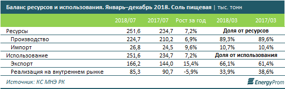 Соль в РК импортируют мало: местное производство по итогам января–декабря 2018 года обеспечило более 89% спроса. Более того, перекрыв внутренний рынок, казахстанские компании наращивают экспортные поставки: плюс 15,4% год-к-году, до 116,2 тыс. тонн.