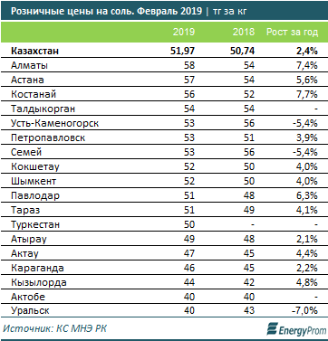 Дороже всего соль стоит в Алматы (58 тг за кг), Астане (57 тг за кг) и Костанае (56 тг за кг). Самое заметное удорожание зафиксировано в Костанае (+7,7% за год) и Алматы (+7,4%). Снизилась цена сильнее всего в Уральске — сразу на 7%, до 40 тг за кг.