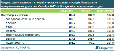 По итогам октября уровень инфляции в РК составил к началу года 5,4%. Для сравнения, в соседней по ЕАЭС России удорожание товаров и услуг в декабре 2016 составило всего 1,9%, в Кыргызстане — 2%.