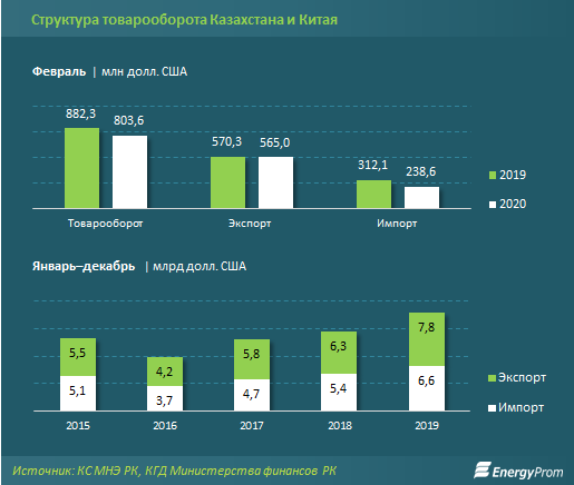 Крупнейшим торговым партнёром Казахстана вне стран ЕАЭС является Китай. За январь-февраль текущего года товарооборот между странами составил 2,2 млрд долл. США, в том числе экспорт — 1,4 млрд долл. США, импорт — 789,7 млн долл. США. По сравнению с аналогичным периодом 2019 года объём взаимной торговли вырос на 7,9%, или 159,6 млн долл. США. В основном рост взаимной торговли между странами произошёл в январе, но уже в феврале текущего года, вследствие борьбы с распространением COVID-19, товарооборот между Казахстаном и Китаем упал на 9%. Напомним, в конце января правительство РК приостановило работу МЦПС «Хоргос», а в начале февраля Казахстан прекратил прямое сообщение с КНР, что и явилось основной причиной снижения товарооборота между странами.