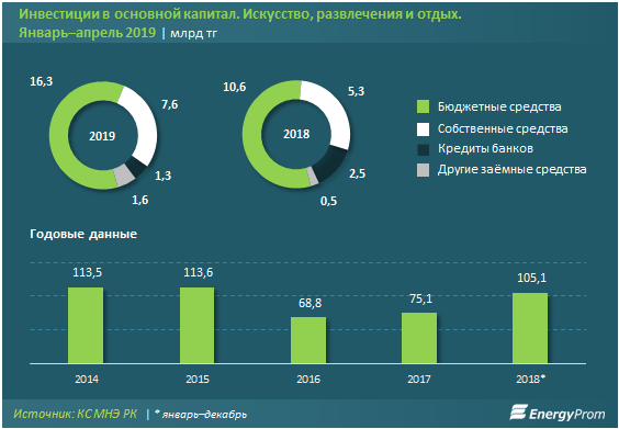 По итогам прошлого года* инвестиции в сферу искусства и досуга составили 105,1 млрд тенге. Заметим, в соответствующем периоде, после резкого сокращения инвестиций в 2016 году до 68,8 млрд тенге для капвложений, для сектора характерна положительная динамика.