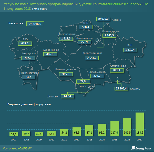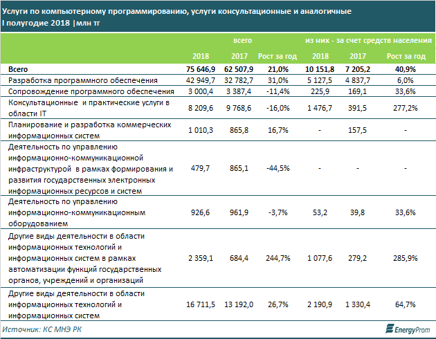 По итогам первого полугодия услуги по компьютерному программированию, консультационные и прочие в секторе составили 75,6 млрд тг – на 21% больше, чем в аналогичном периоде прошлого года.