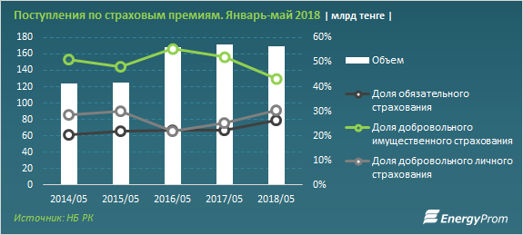 Поступления по страховым премиям за январь-май 2018 года составили 168,7 млрд тг, что на 1,5% меньше, чем за аналогичный период прошлого года. Это было вызвано тем, что сократились поступления по добровольному имущественному страхованию — на 18,5%, до 73,1 млрд тг, при этом их доля от всех страховых премий сократилась за год с 52,3% до 43,3%.