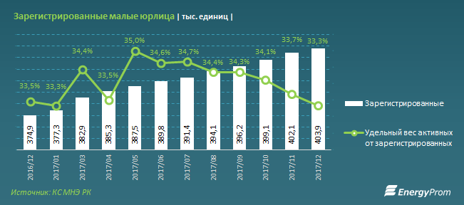 В 2017 году казахстанский регистр малых компаний (юрлица) увеличился на 29 тысяч. Активных малых предприятий — всего на 9 тысяч. Реально работают всего 33% зарегистрированных субъектов малого бизнеса. Закрыть предприятие гораздо сложнее, чем открыть.
