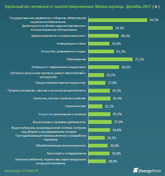 Наиболее стабильный сектор для малых предприятий, естественно, государственное управление. Из 9 тысяч зарегистрированных организаций активно работают 8,6 тысячи (95%). В образовании активно работает 71% от зарегистрированных, в секторе операций с недвижимостью — 49%, в здравоохранении — 48%. В данных отраслях высокий уровень государственных предприятий и низкий уровень конкуренции. В пяти отраслях из 20 работающие компании составляют менее 30%. Самый высокий уровень конкуренции в строительстве и торговле — 22 и 25%, соответственно.