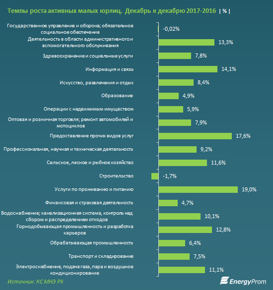 Самый высокий уровень бизнес-активности наблюдается в сервисных секторах. Стремительно развивается туристический бизнес, количество работающих компаний, оказывающих услуги по проживанию и питанию, выросло на 19%. Сектор прочих услуг по числу активных компаний вырос на 17%, информация и связь — на 14%. В строительной отрасли малый бизнес сжимается, работающих компаний стало меньше на 1,7%.