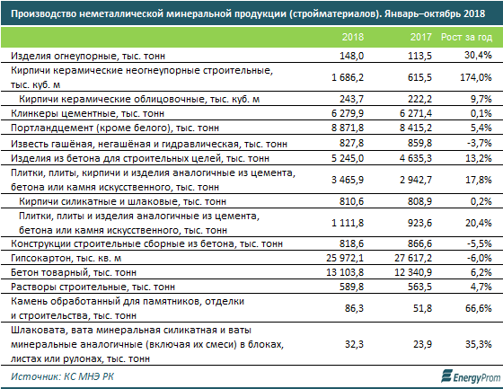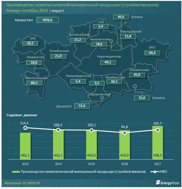 За 9 месяцев 2018 года производство стройматериалов и прочей подобной минеральной продукции достигло почти 500 млрд тг — на 40% больше, чем годом ранее.