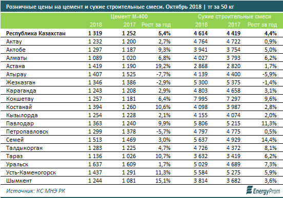 По итогам октября 2018 года цена за 50-килограммовый мешок цемента марки прочности М-400 выросла на 5,4%, до 1319 тенге; строительных смесей — на 4,4%, до 4614 тенге.
