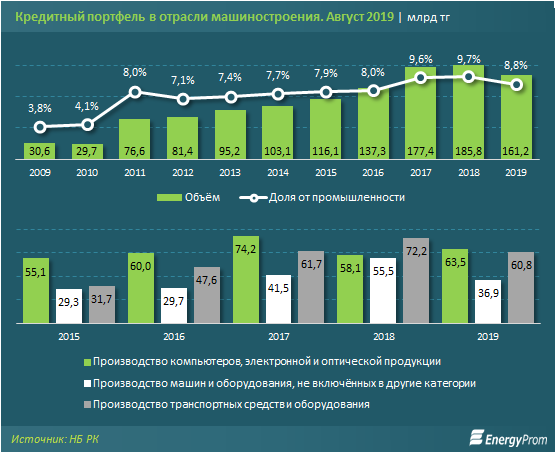 Объём кредитов в отрасли машиностроения за год сократился на 13,3% и на конец августа 2019 года составил 161,2 млрд тг. Доля машиностроения от кредитования промышленности сократилась за год с 9,7% до 8,8%.