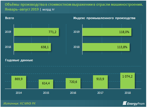 В целом за 2018 год объём услуг в отрасли машиностроения достиг рекордных 1,1 трлн тг. Индекс промышленного производства к 2017 году составил 114,1%.
