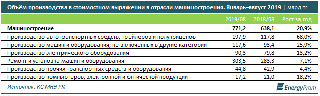 В отрасли машиностроения наибольший годовой рост был отмечен в сфере производства автотранспортных средств, трейлеров и полуприцепов: на 68%, до 197,9 млрд тг. Производство машин и оборудования, не включённых в другие категории, увеличилось на 25,9%, до 117,6 млрд тг. На третьем месте производство электрического оборудования: рост за год на 13,2%, до 90,3 млрд тг.