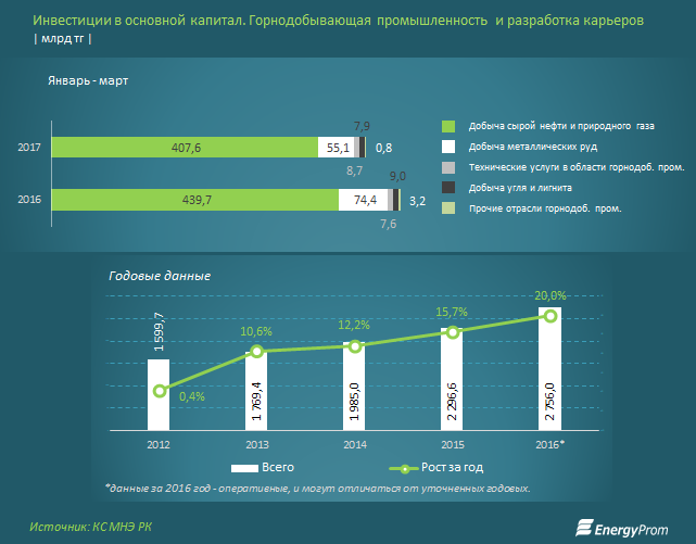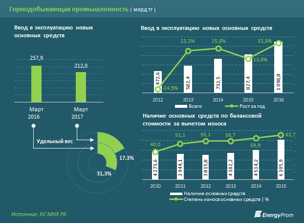 По итогам 1 квартала 2017 ввод в эксплуатацию зданий и сооружений, техники, оборудования и прочих основных средств в сегменте горной добычи составил 212 млрд тг — это на 17,8% меньше, чем годом ранее. Для сравнения, в целом по РК обновление материальных активов, напротив, ускорилось, показав по итогам января-марта 2017 +48,3% год-к-году. В результате проседания, доля добывающей промышленности составила лишь 17,3% в общем объеме ввода основных средств, против 31,3% годом ранее.