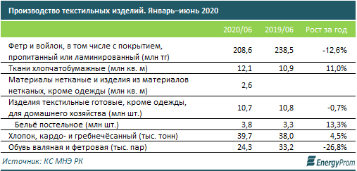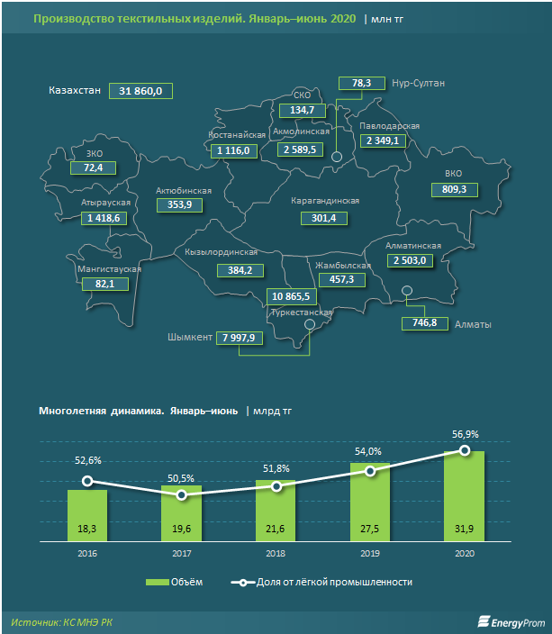 Объём производства текстильных изделий за первое полугодие текущего года составил 31,9 млрд тг — на 15,7% больше, чем годом ранее. В плане реального роста в секторе также наблюдается положительная динамика: индекс промышленного производства к январю–июню прошлого года составил 108,4% — немногим больше, чем в целом по лёгкой промышленности (108%).