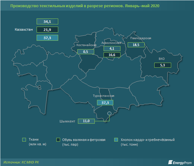 Основной объём производства тканей в разрезе регионов за январь–май 2020 года пришёлся на Павлодарскую область (18,5 млн кв. м) и Шымкент (11 млн кв. м).
