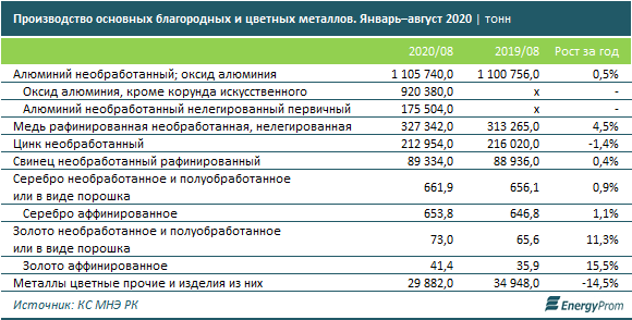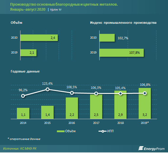 Производство основных благородных и цветных металлов за январь–август 2020 года составило в денежном выражении 2,4 трлн тг — на 16% больше по сравнению с аналогичным периодом прошлого года (при этом ИПП — всего 102,7%).