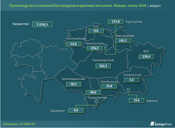 Среди регионов РК за январь–июль 2020 года более половины объёма производства благородных и цветных металлов пришлось лишь на два региона: Восточно-Казахстанскую область (576,4 млрд тг), где рост составил 3,8%, и Карагандинскую область (562,3 млрд тг), где рост по сравнению с январём–июлем 2019 года в денежном выражении составил 13,4%.