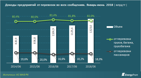 Основной доход получен от провозки грузов и багажа — 1,1 трлн тг или 82% от всего объема, рост за год — на 17,8%. От перевозки пассажиров за первое полугодие предприятия транспорта заработали 238,7 млрд тг или 18% от всего объема доходов соответственно, рост за год — на 16,5%.
